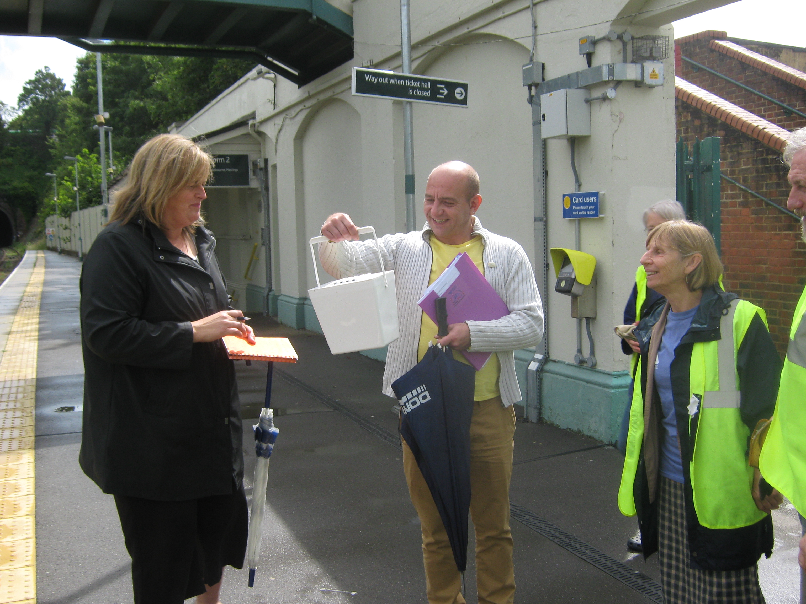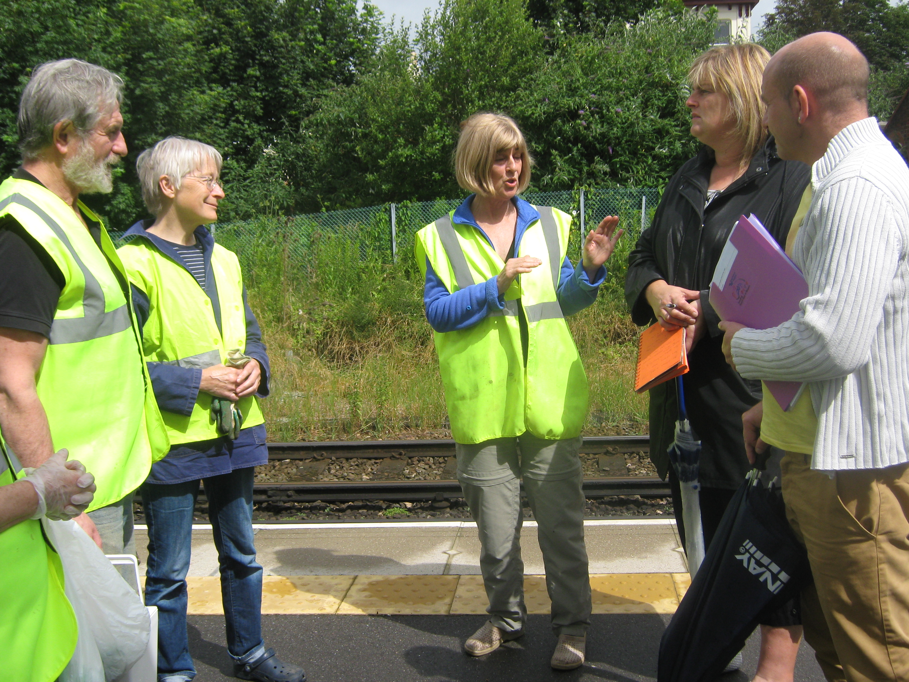 The following day, Southern Water, who are major sponsors of Britain in Bloom, sent along Chris Collins, the gardener from ‘Blue Peter’, to appear in some promotional shots at our garden site. Paul Bigsby from Southern Rail was there to meet not just Chris but also the photographer, the PR person, Andy Shaddick from Southern Water and Nick Turrell from Talisman Communications. Add to this those of our members who were able to attend for the shoot and you can imagine we made quite a crowd around the gated vegetable plot. The photographer got several shots with his state of the art camera and we’re hoping to get a copy of them in due course. Chris Collins from Blue Peter was delighted to be involved as he used to go to Falmer School and his mother was a mature student at Sussex, so he knew the station very well from personal experience.